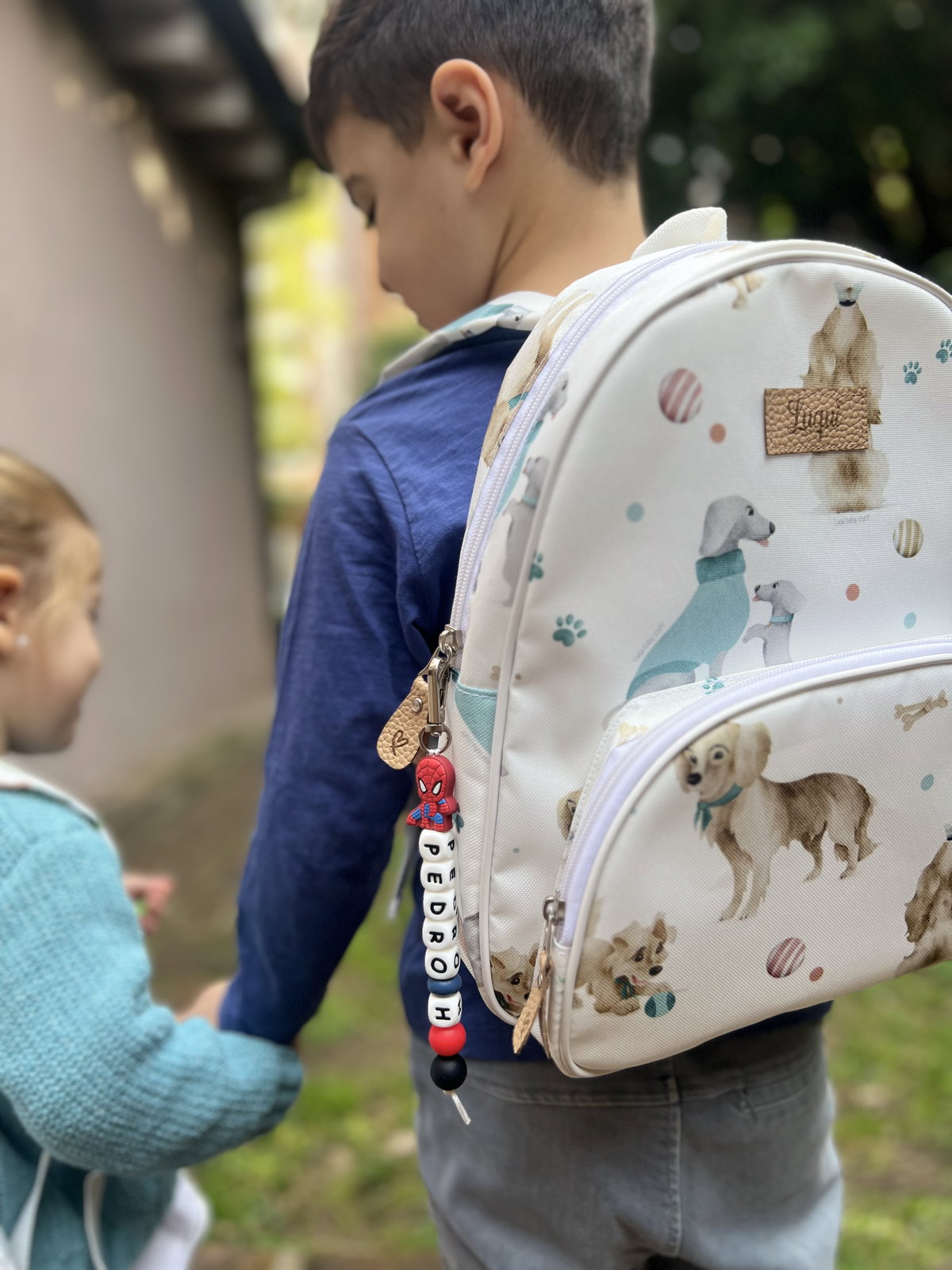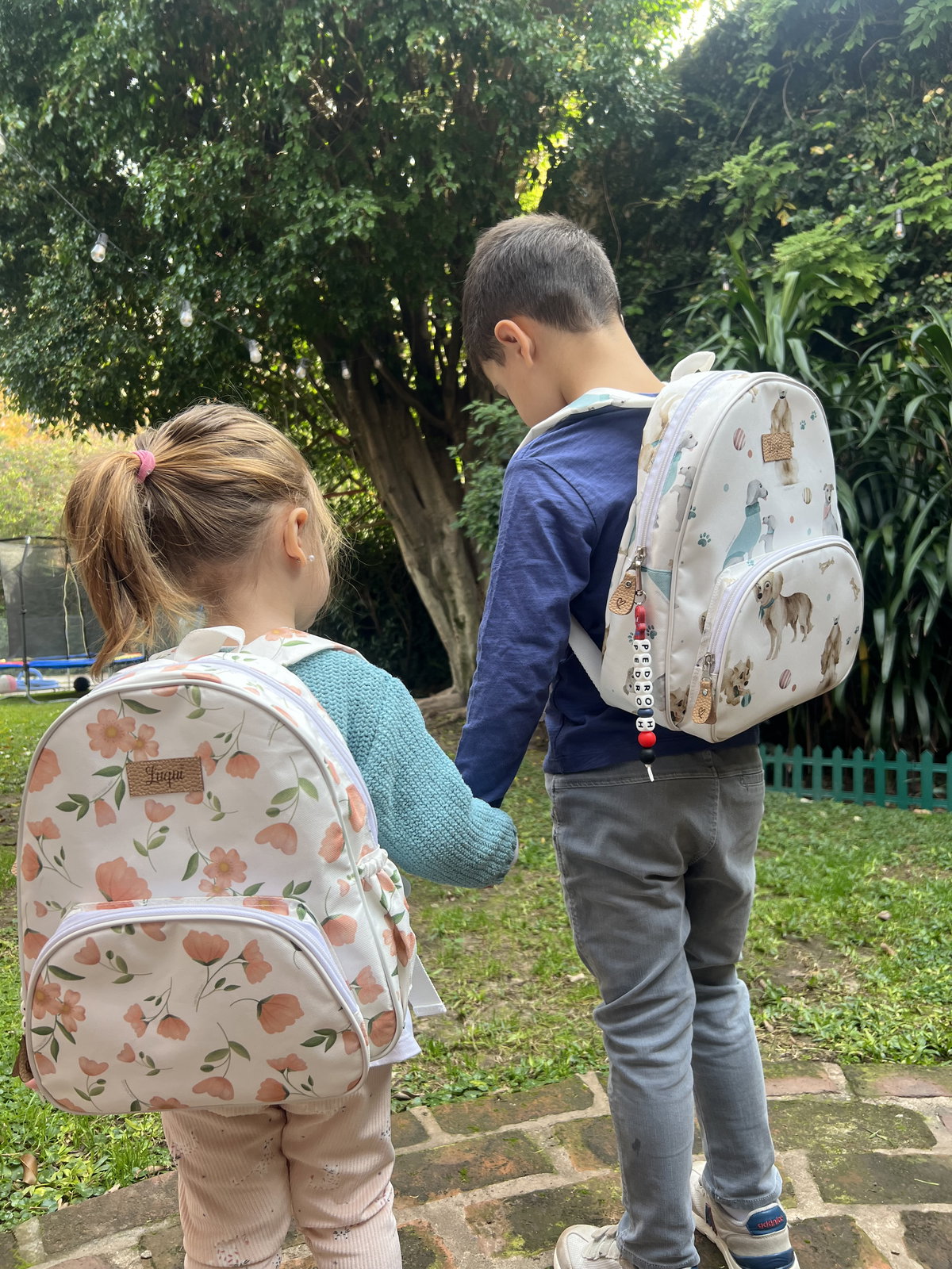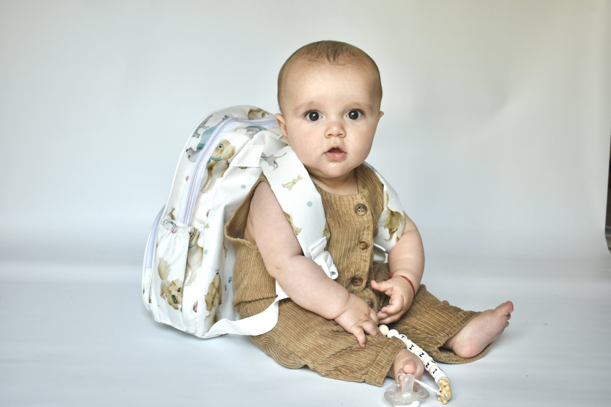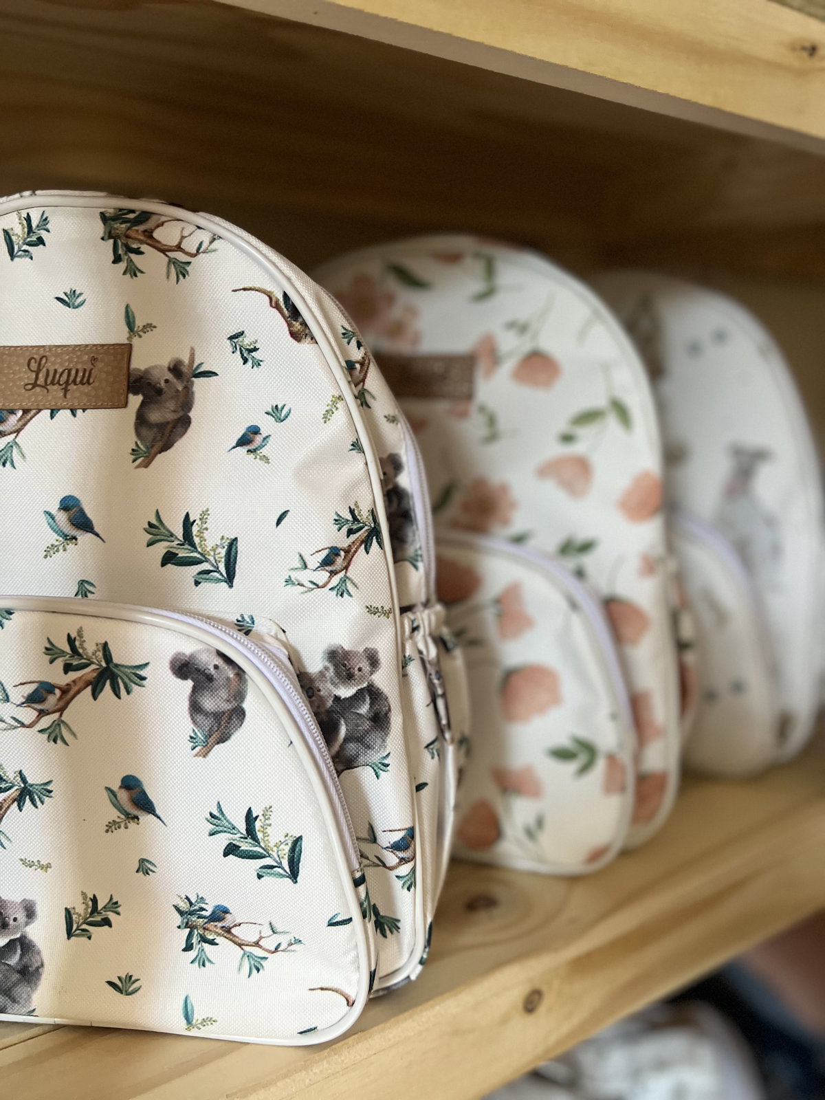 Bolsillo interno divisorio y externo con elástico para mamadera o botellita. Las correas son regulables hasta los 5 años de edad aprox. Ideales para el jardin o la colonia!
