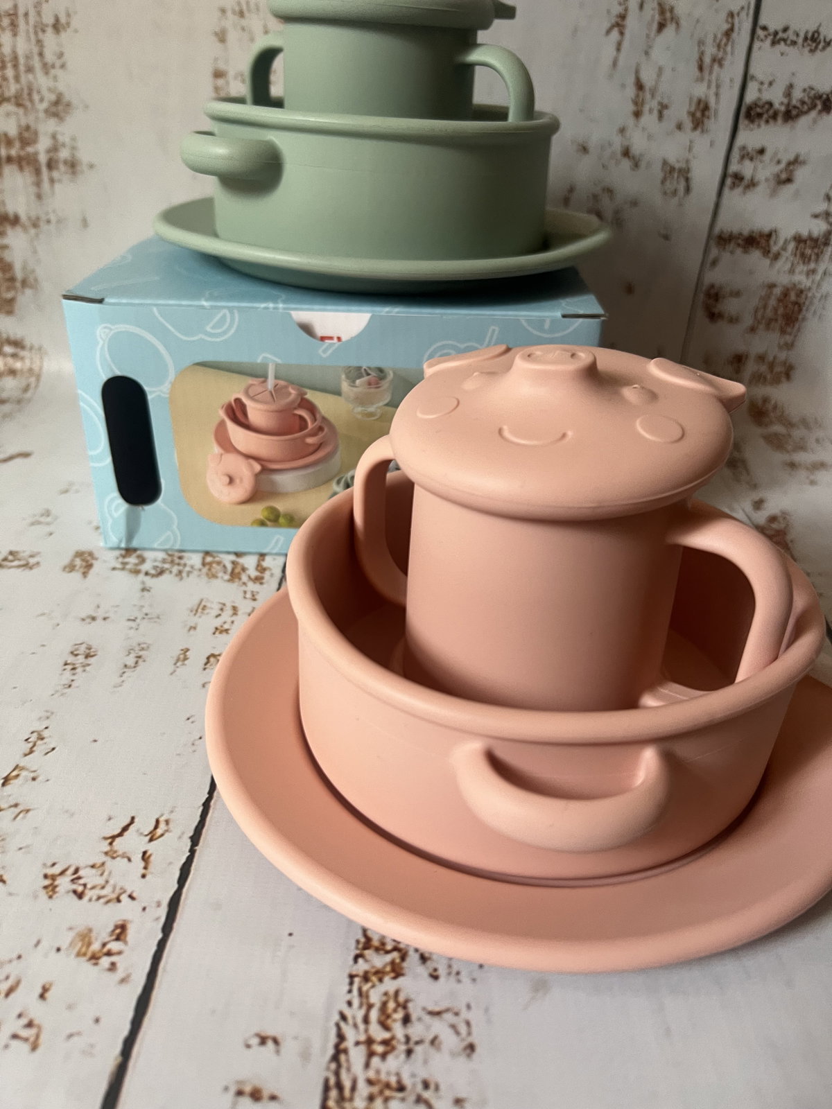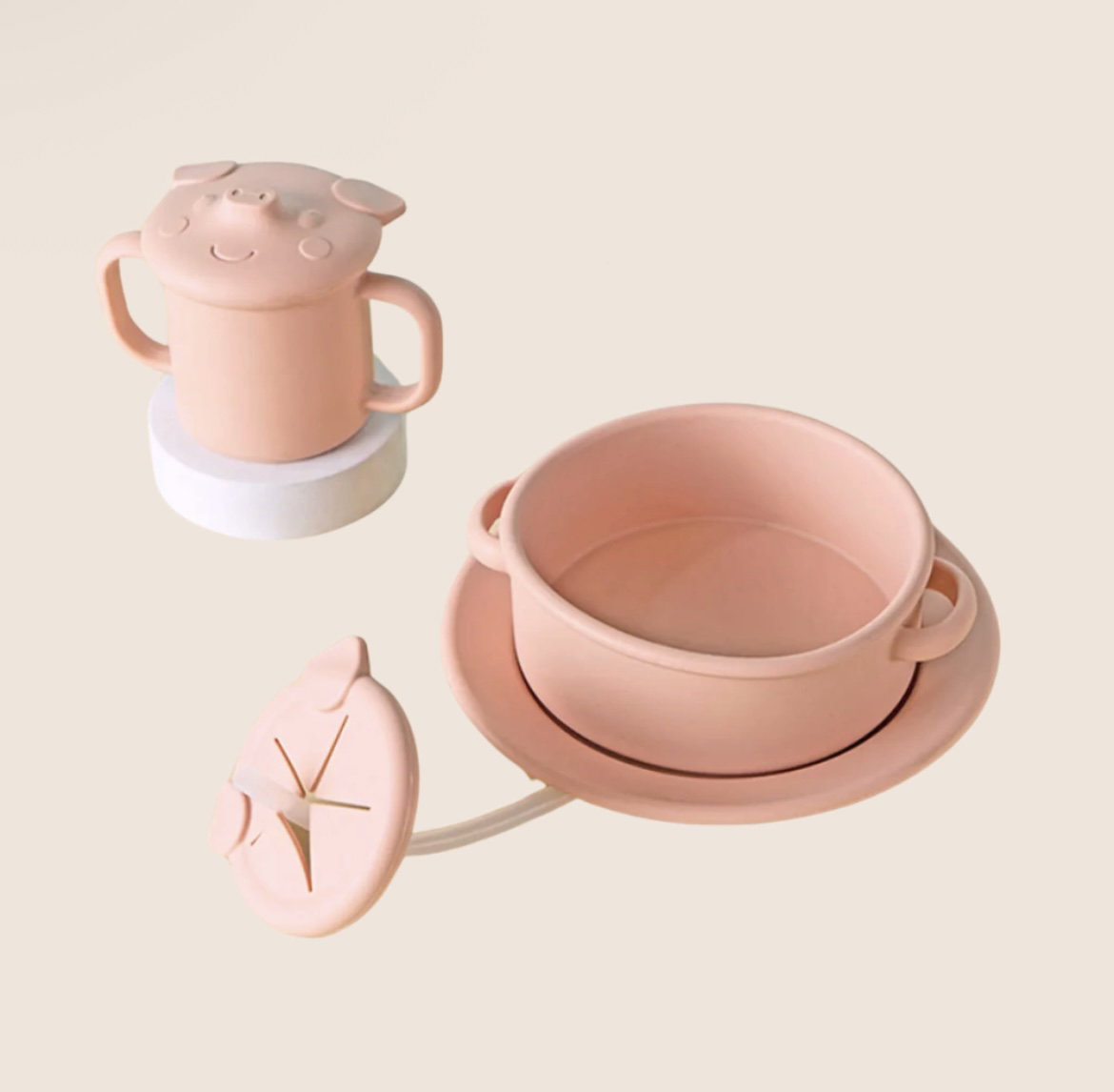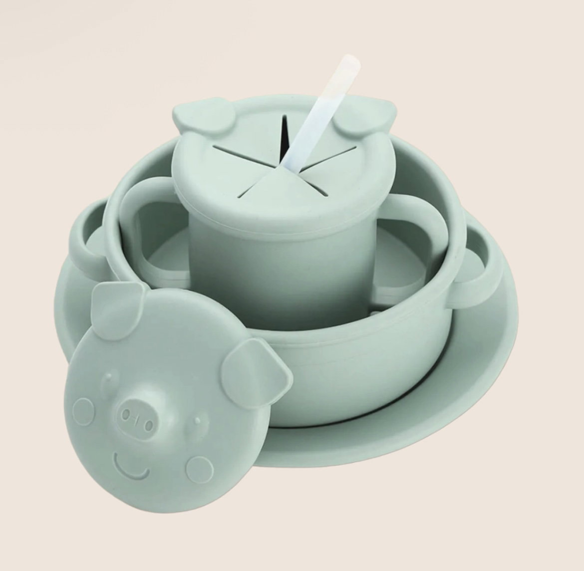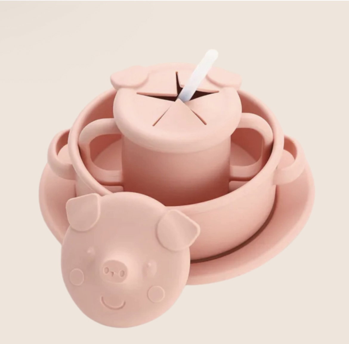 Incluye: - Un plato (18 x 18 cm) - Un bowl (16 x 16,5 x 5 cm) - Un vaso con asas (1,6 x 12 x 7,5 cm) y dos tapas intercambiables: - Una tapa con la carita de Porky, ideal para beber con el sorbete de silicona(12,5 x 0,8 cm). - Otra tapa con orejas de Porky, perfecta para usar como taza cerealera.