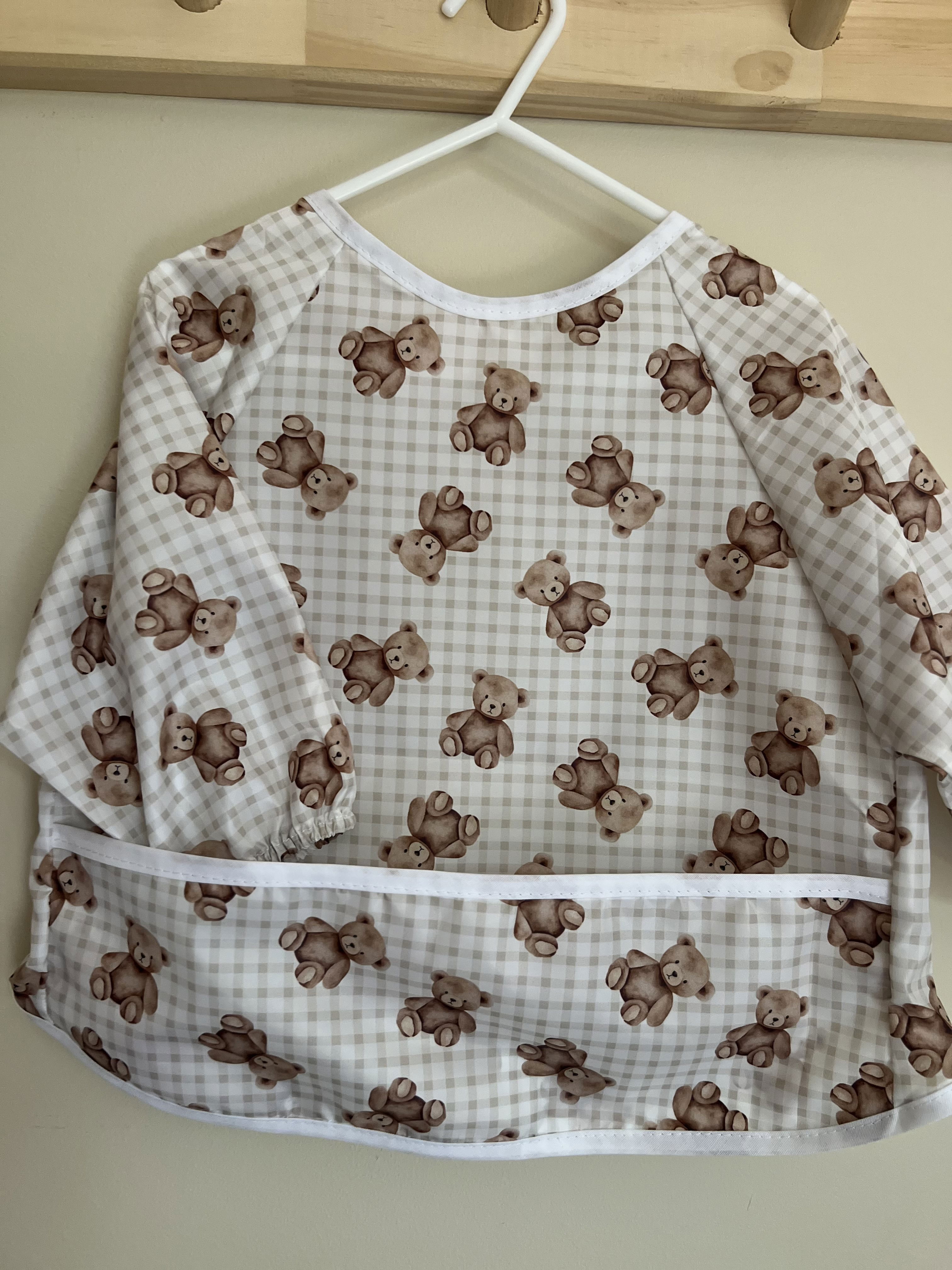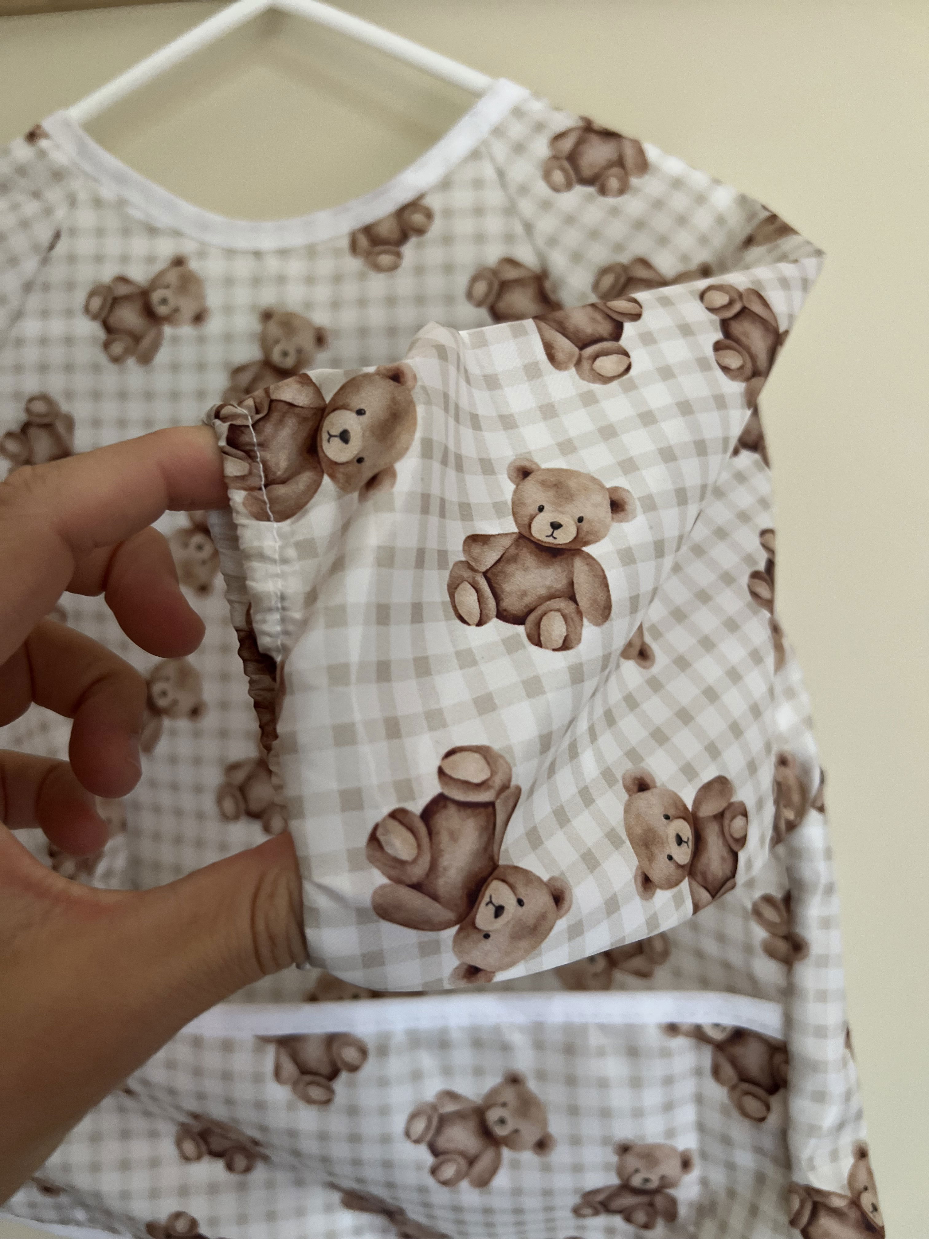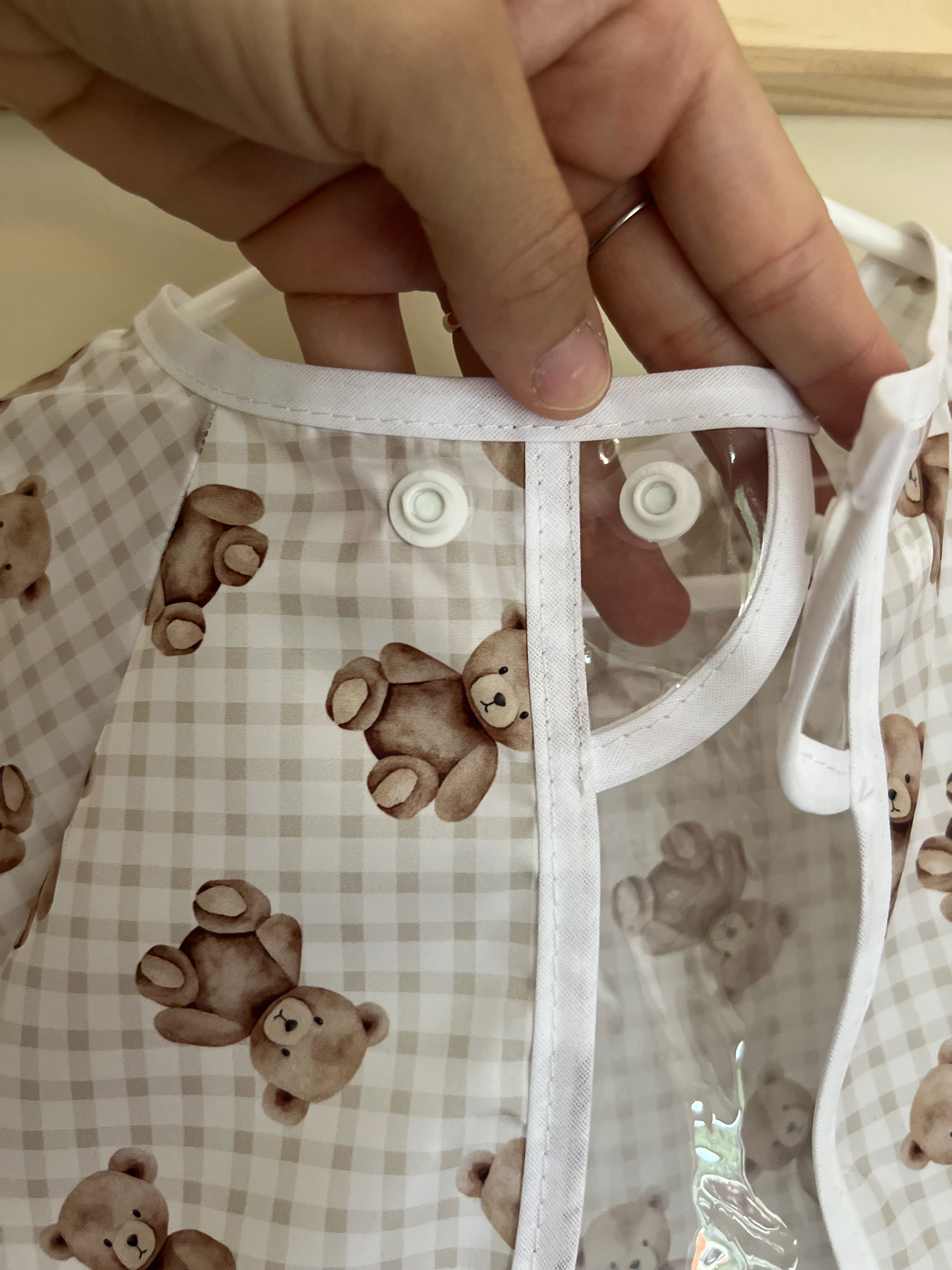 Cuenta con mangas largas con elástico en los puños y un bolsillo delantero que atrapa la comida que se cae antes de llegar a la boca.