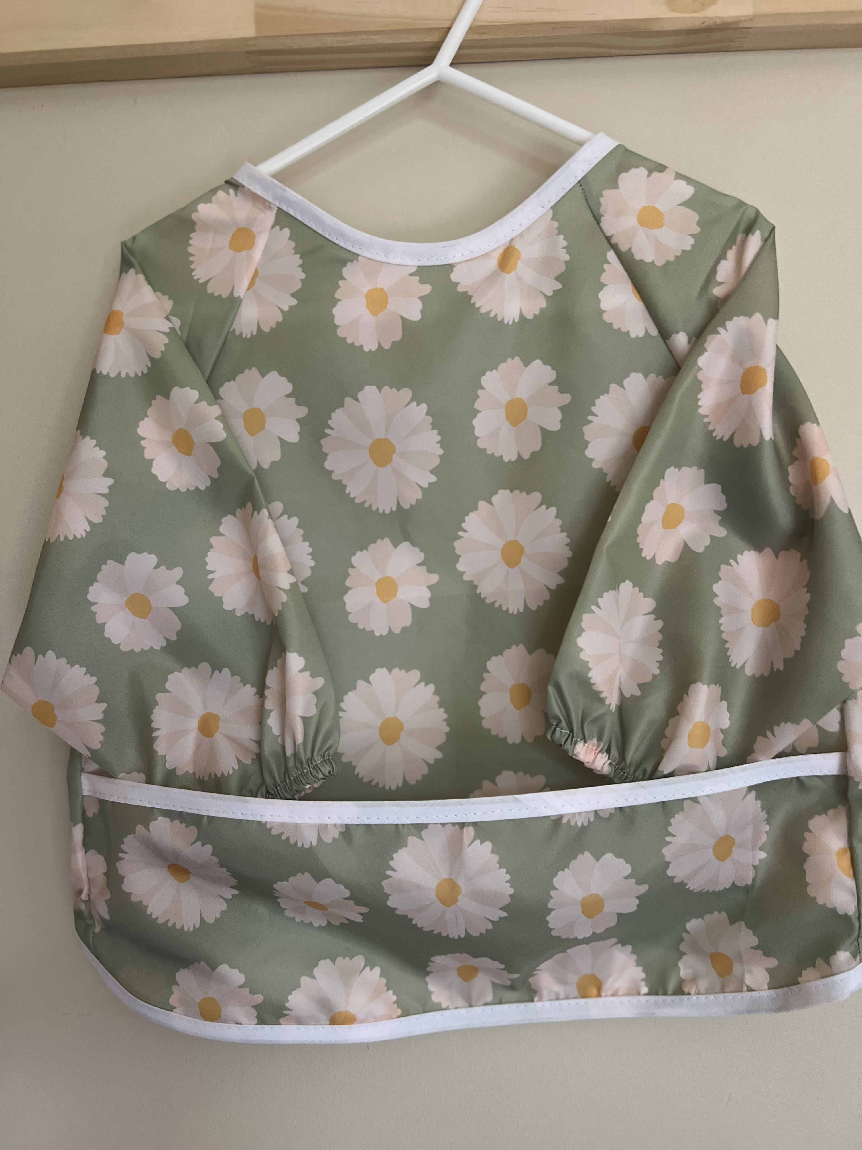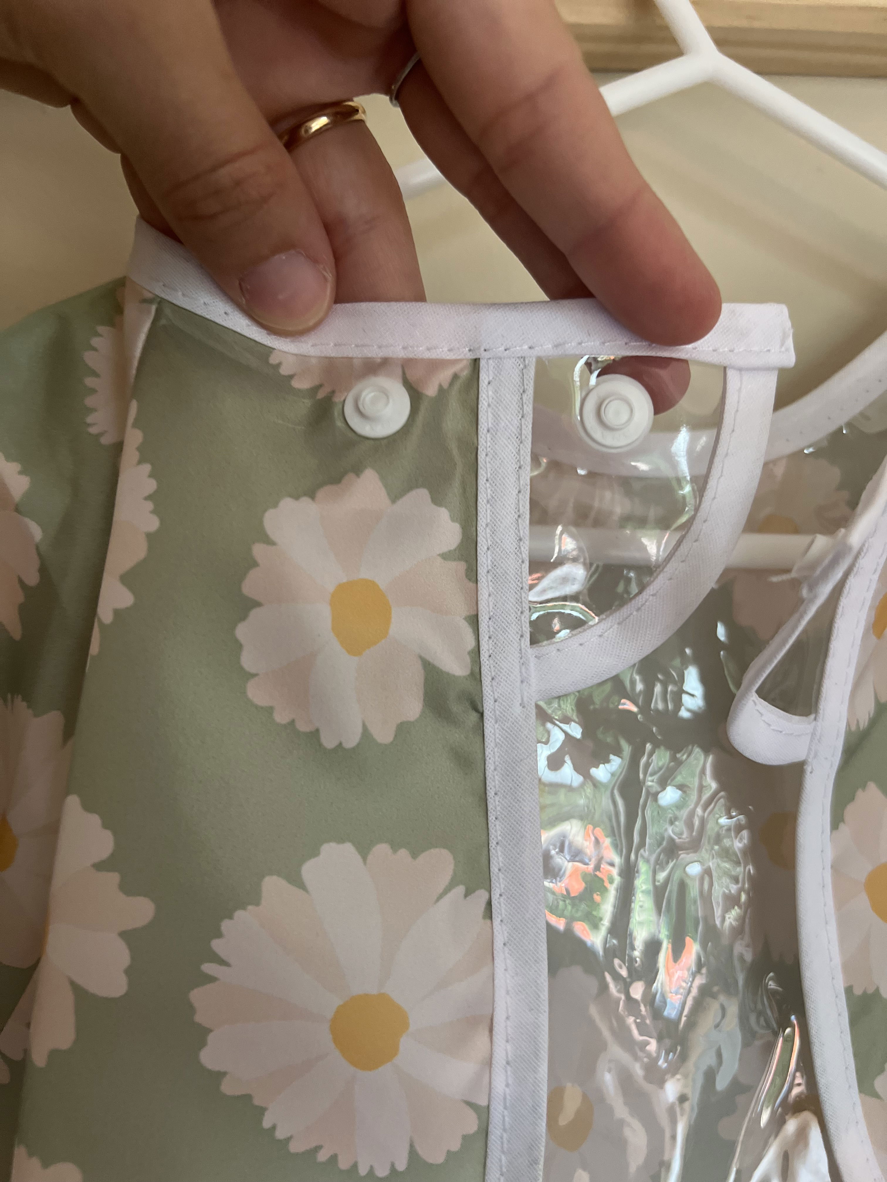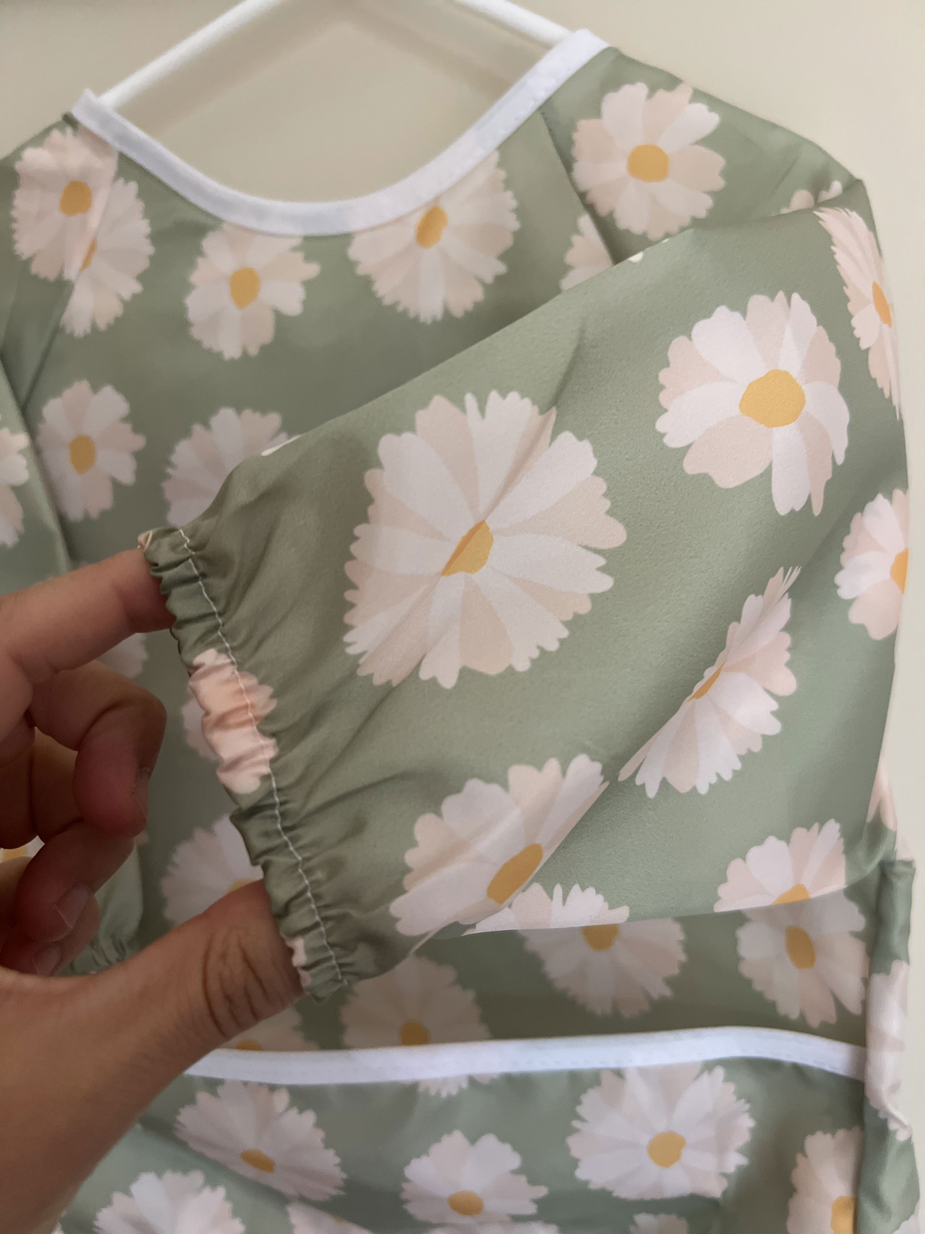 Cuenta con mangas largas con elástico en los puños y un bolsillo delantero que atrapa la comida que se cae antes de llegar a la boca.