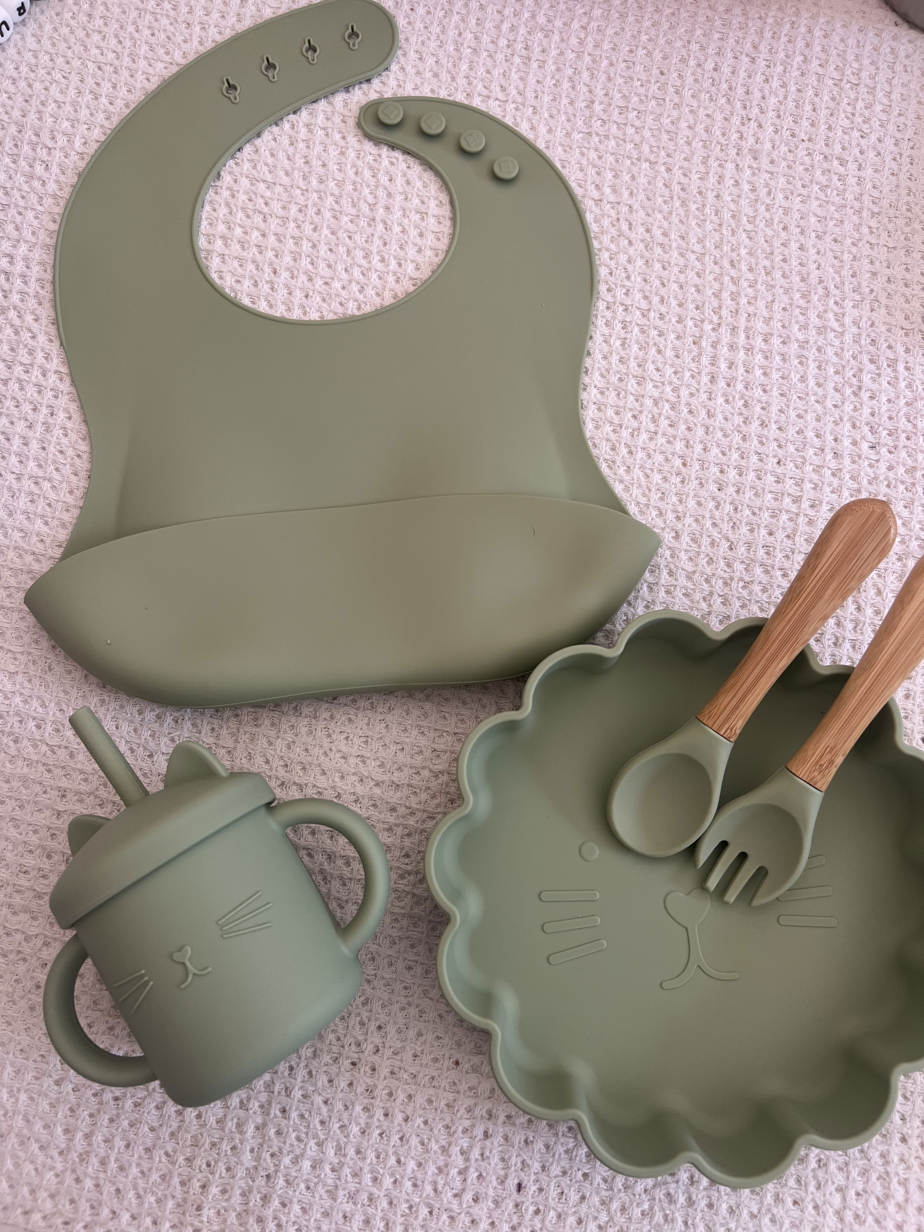 Todo está hecho en silicona libre de BPA, ftalatos y toxinas, pensado para acompañar las primeras comidas con seguridad y estilo.