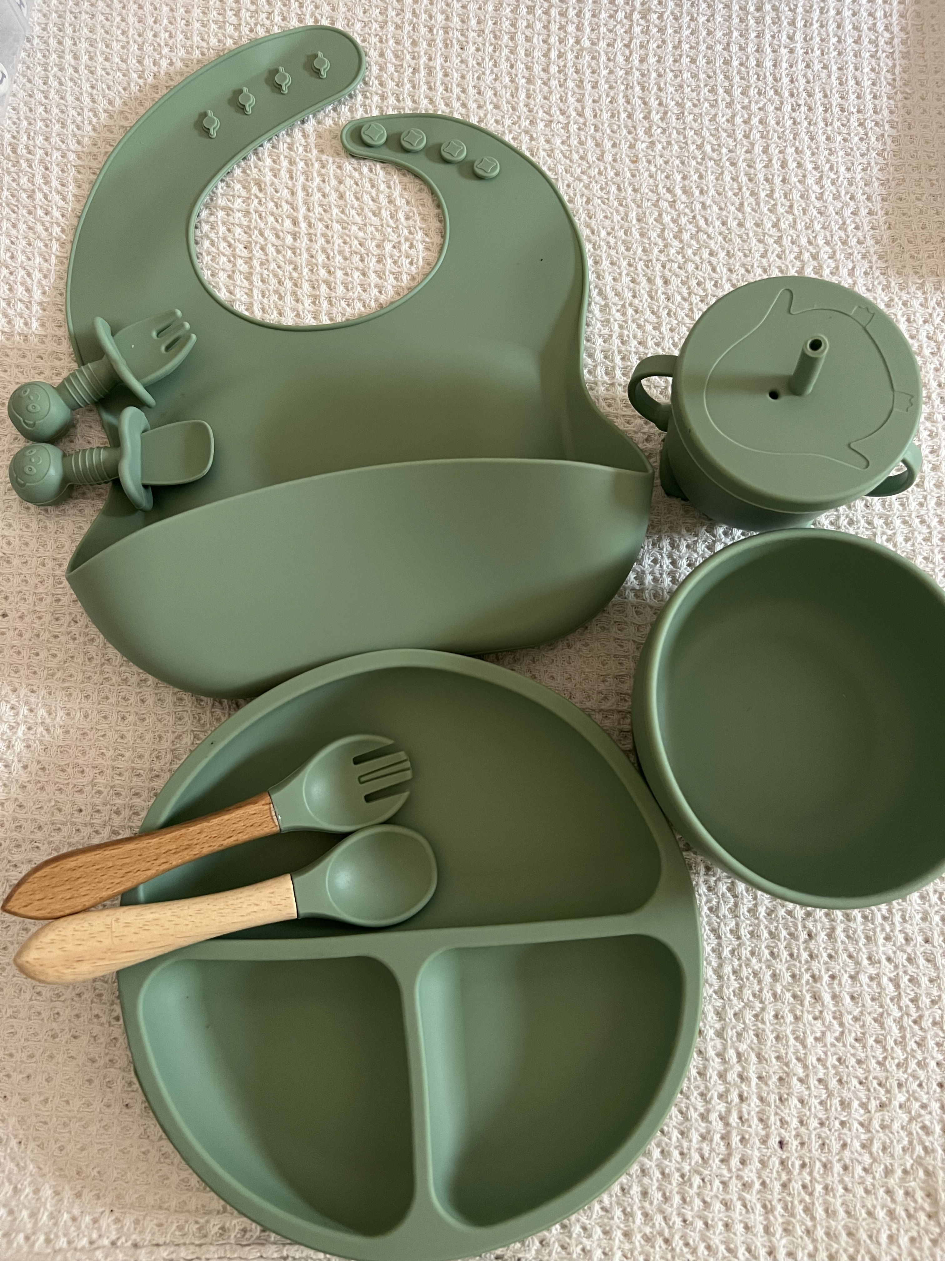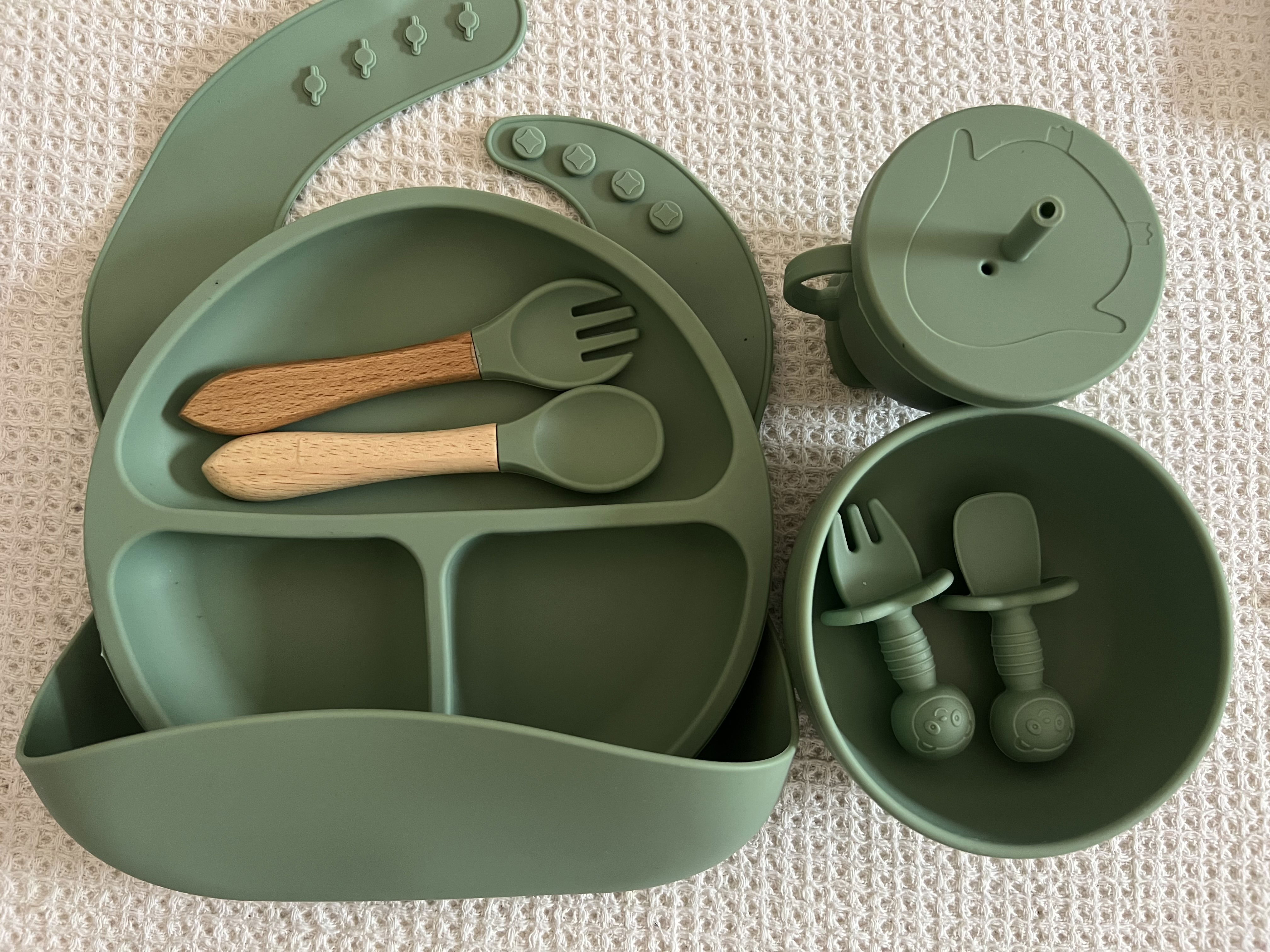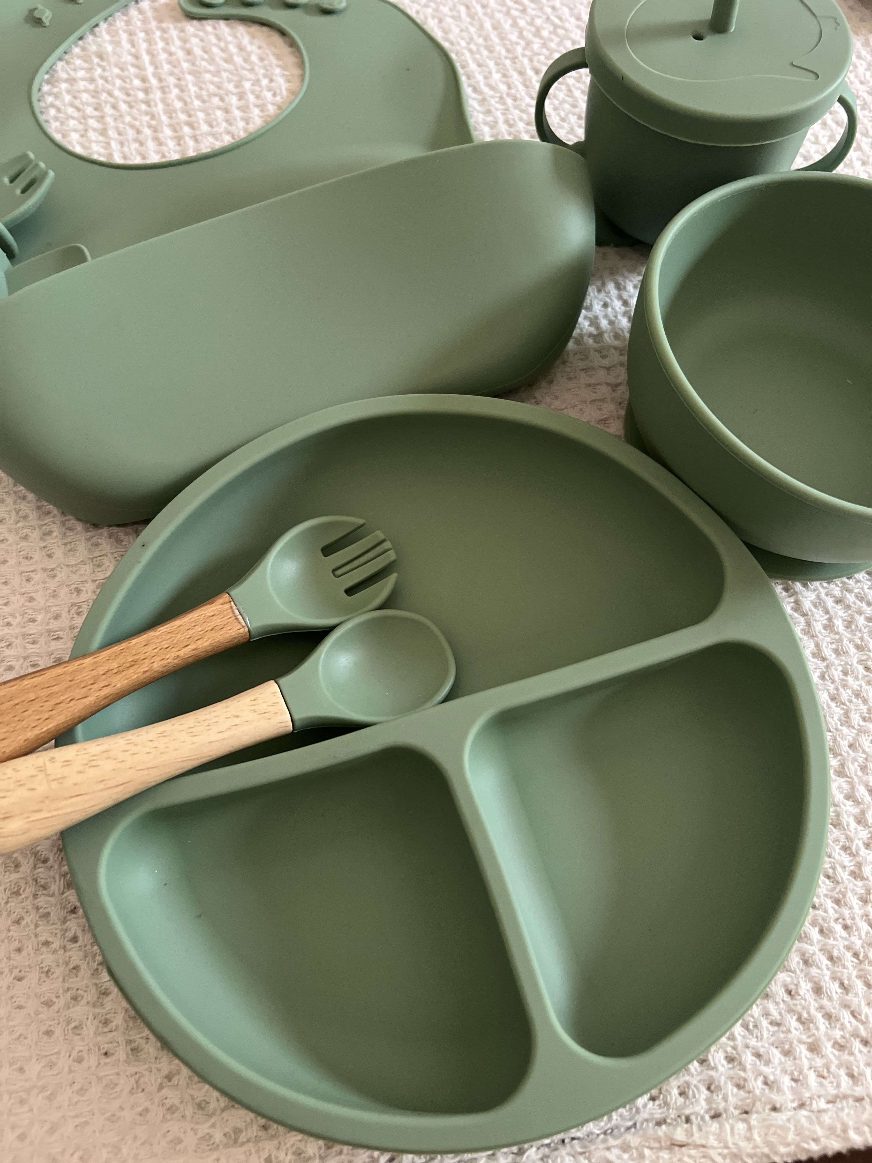 Todo está hecho en silicona libre de BPA, ftalatos y toxinas, pensado para acompañar las primeras comidas con seguridad y estilo.