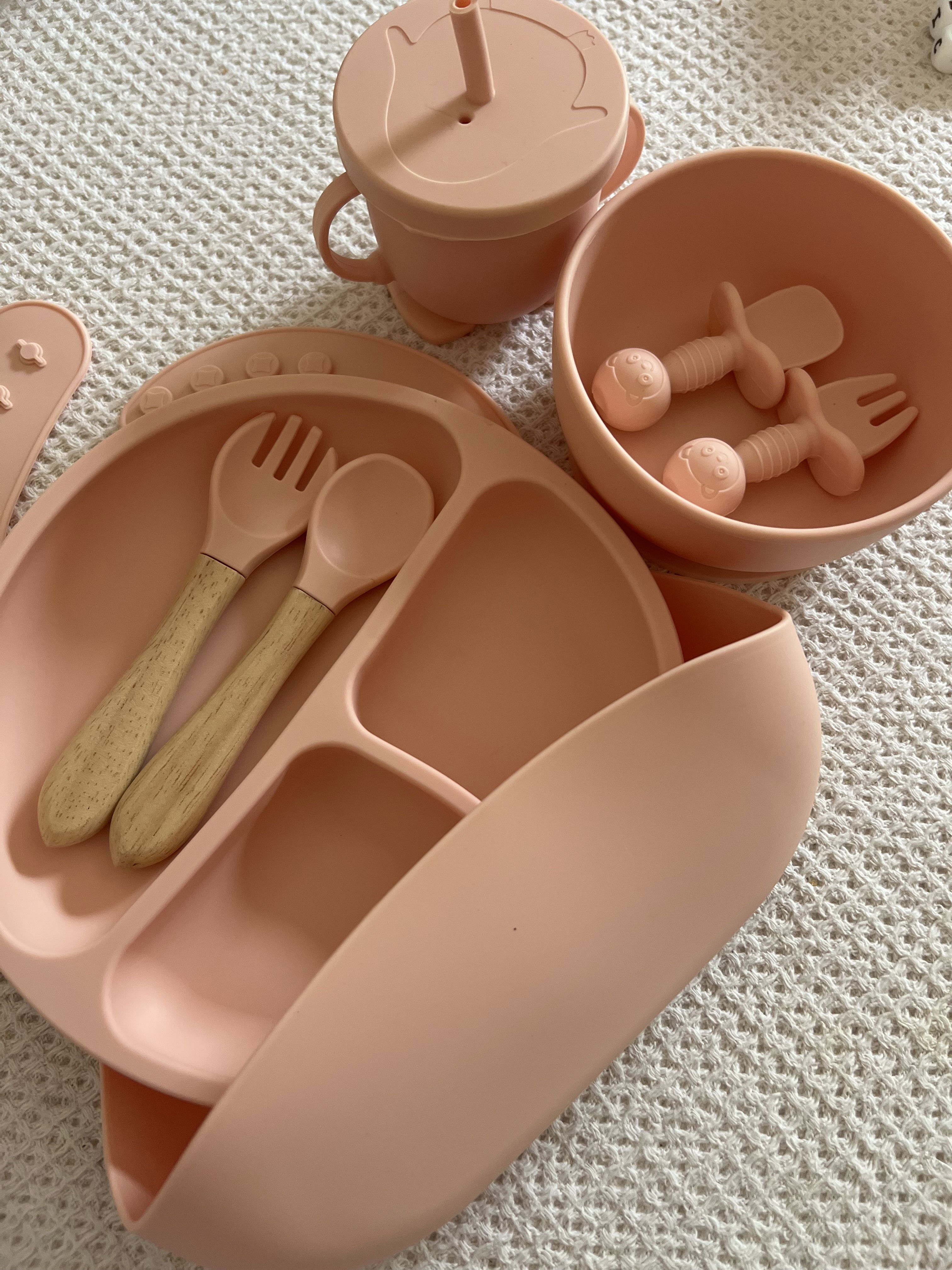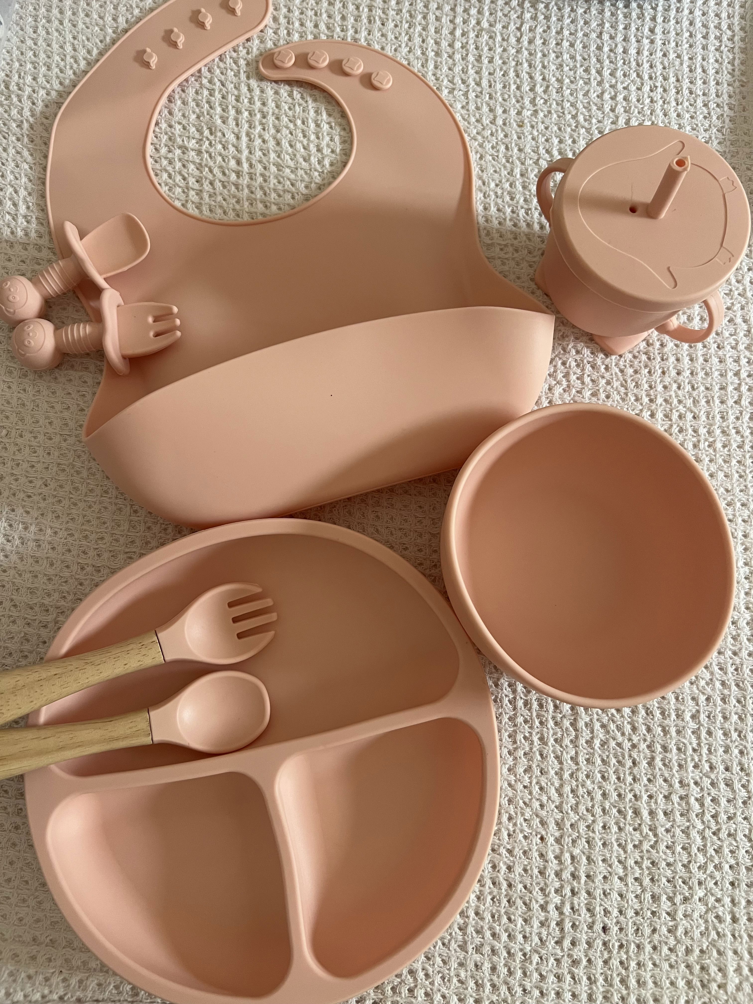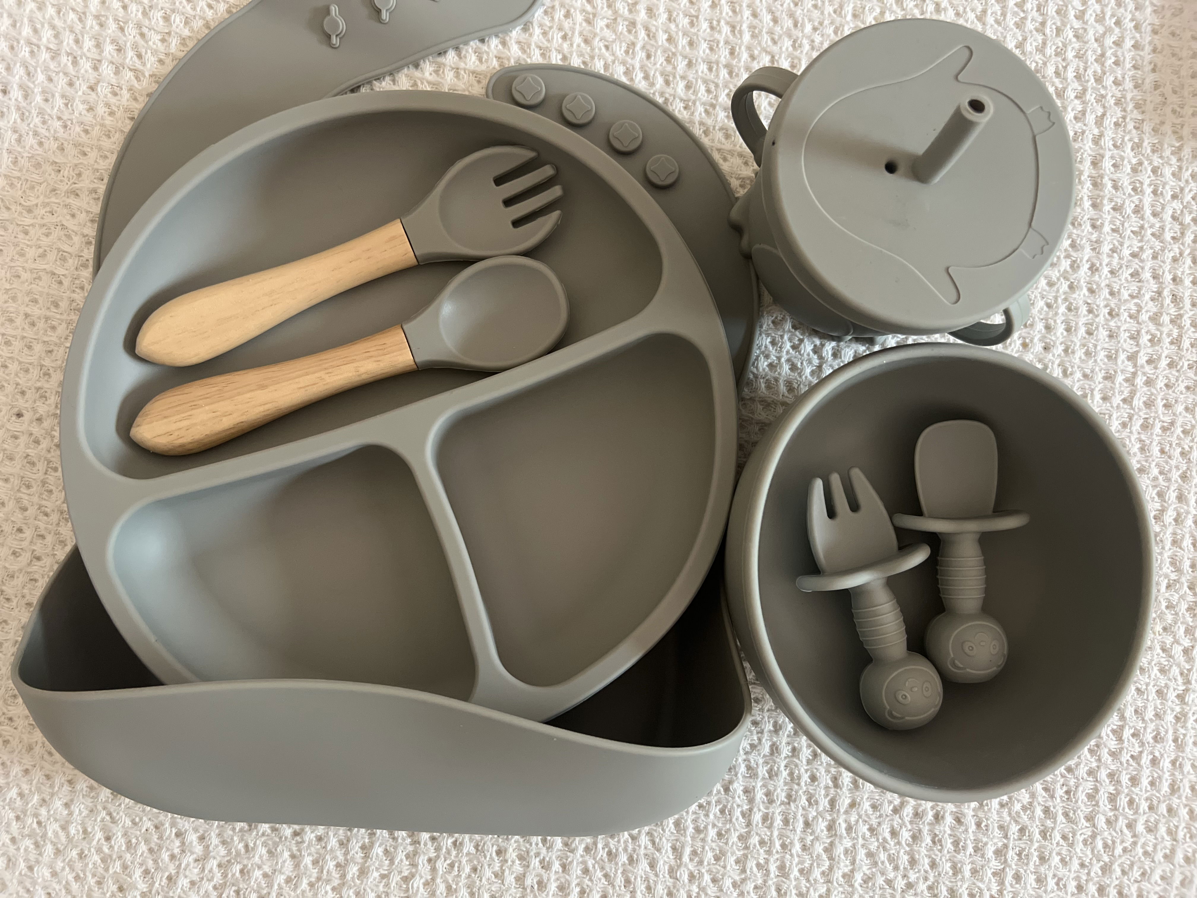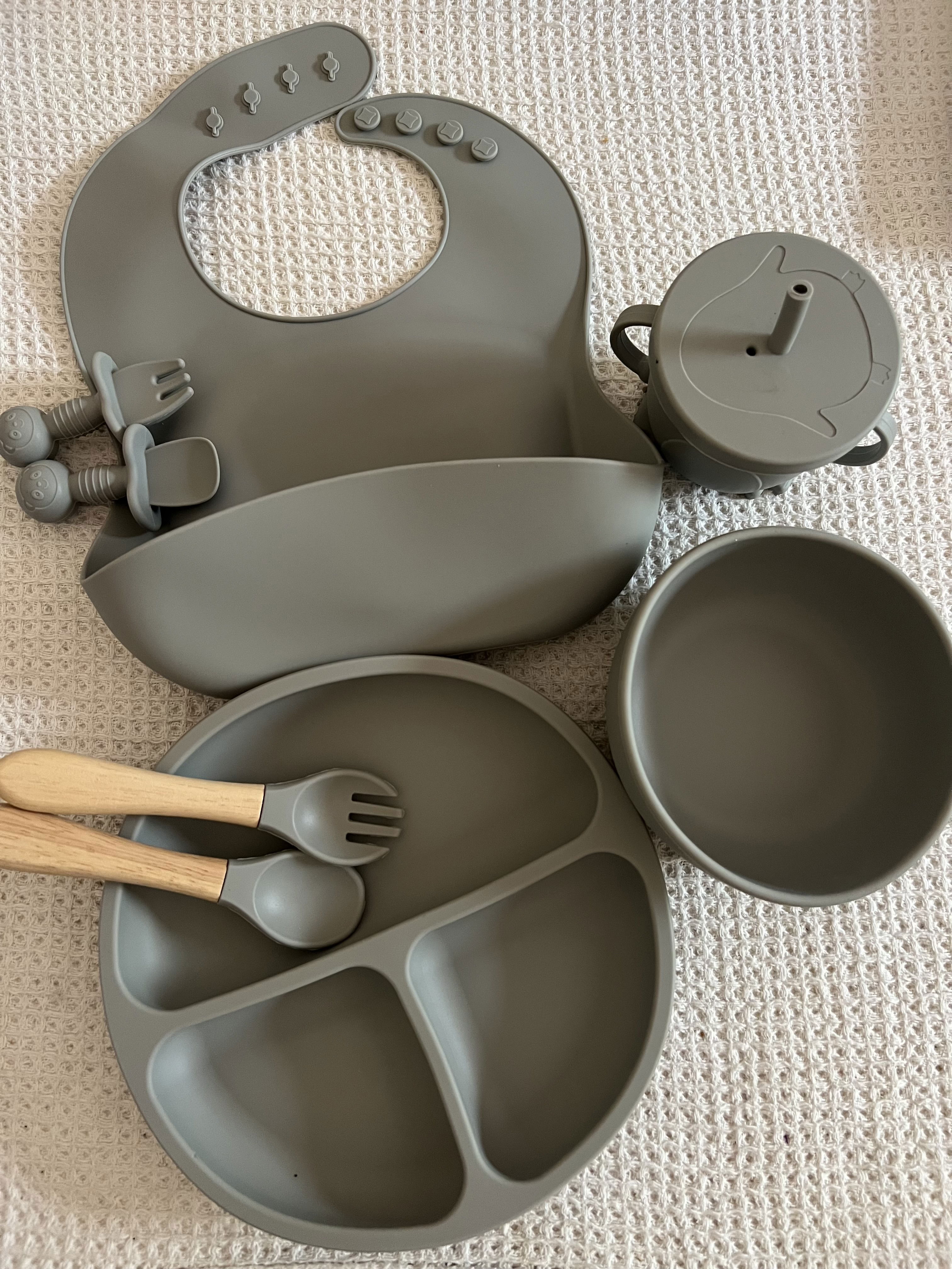 Todo está hecho en silicona libre de BPA, ftalatos y toxinas, pensado para acompañar las primeras comidas con seguridad y estilo.