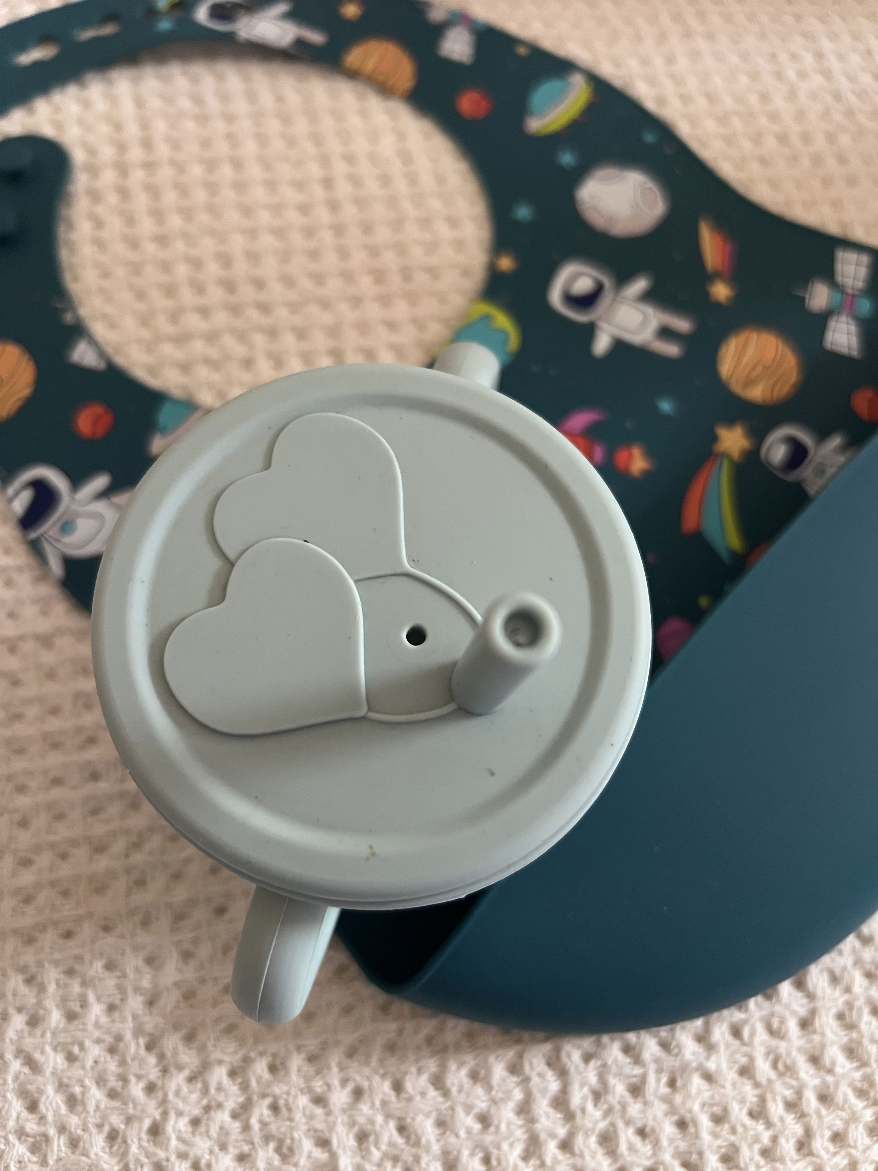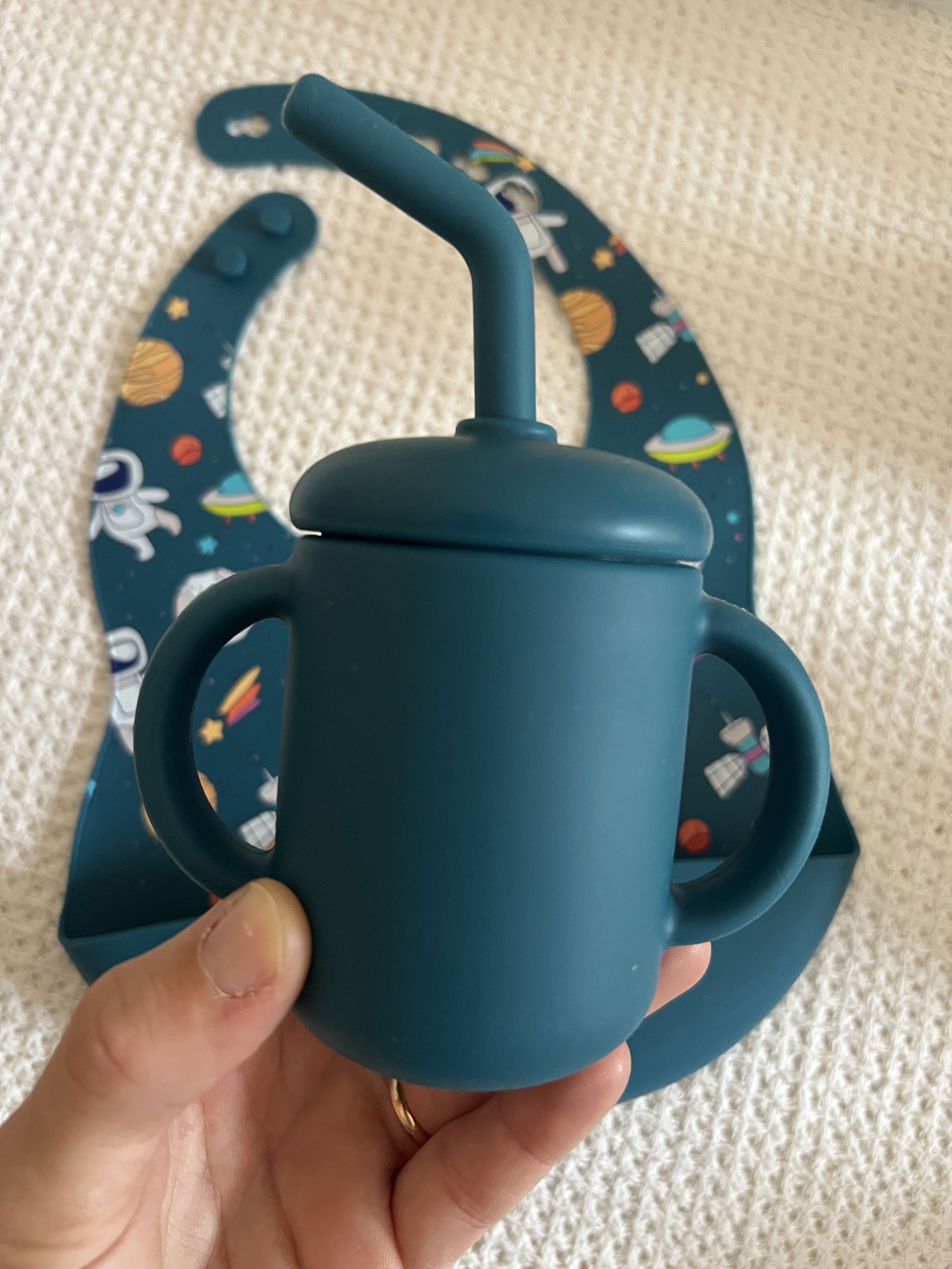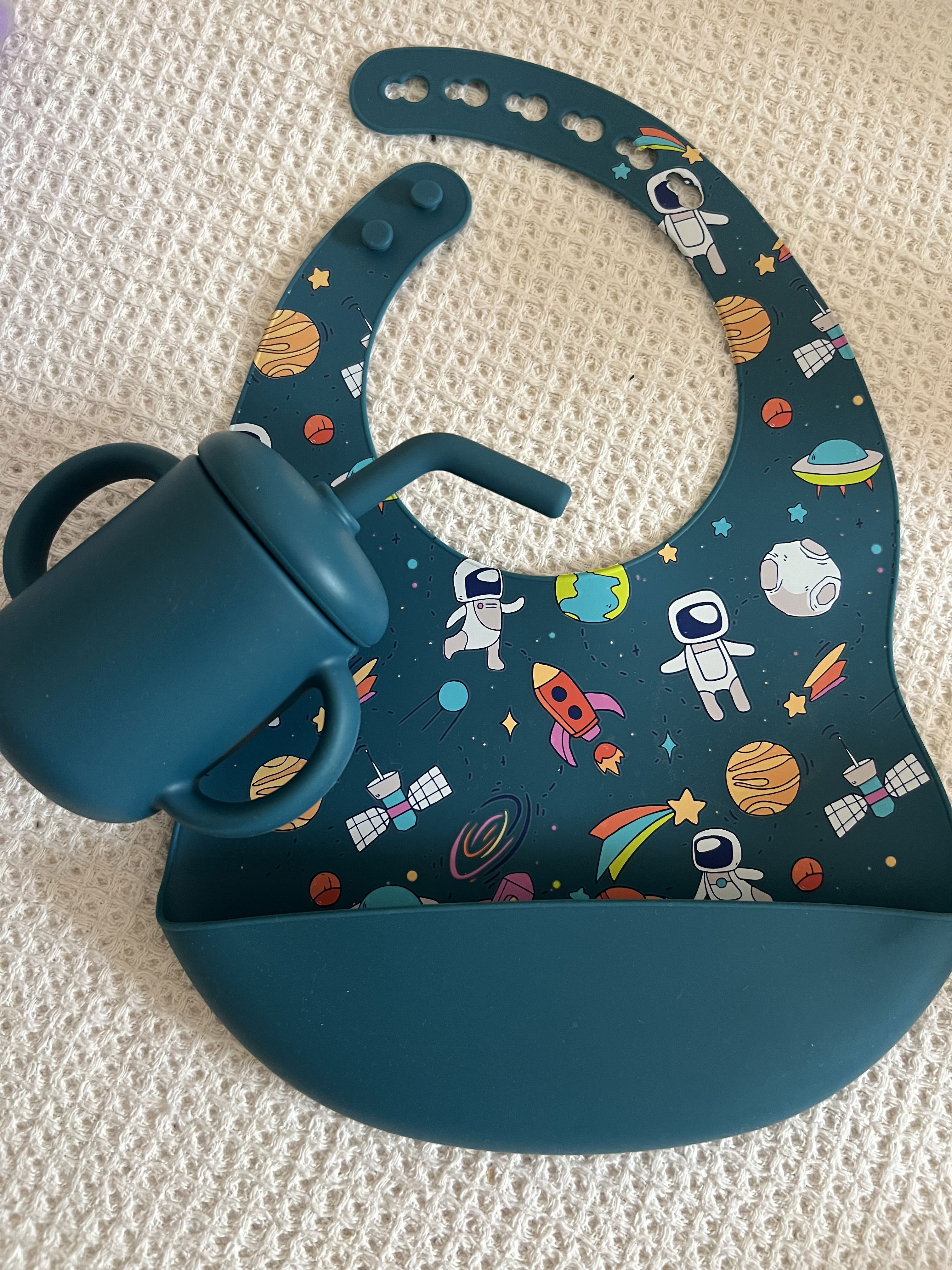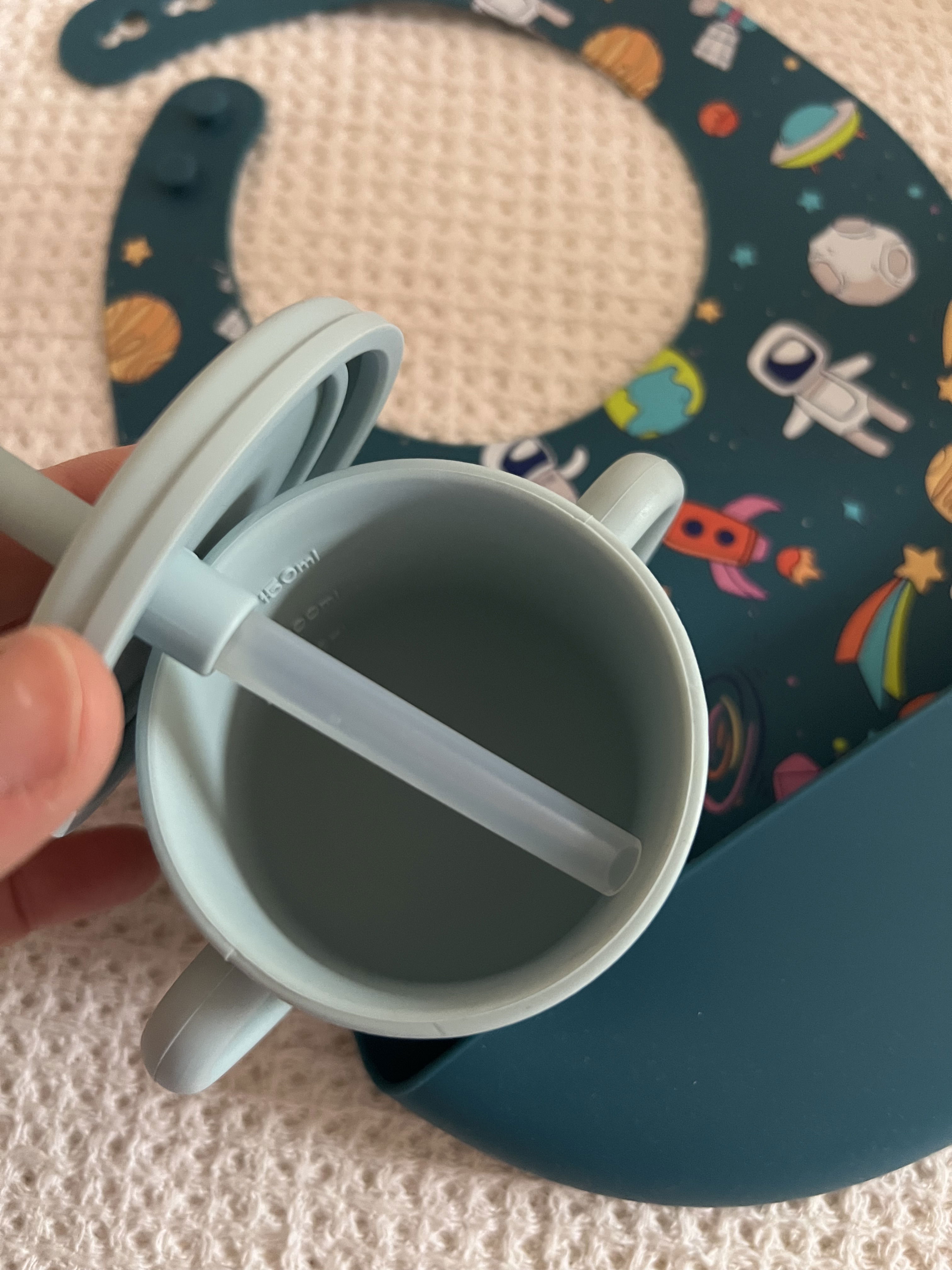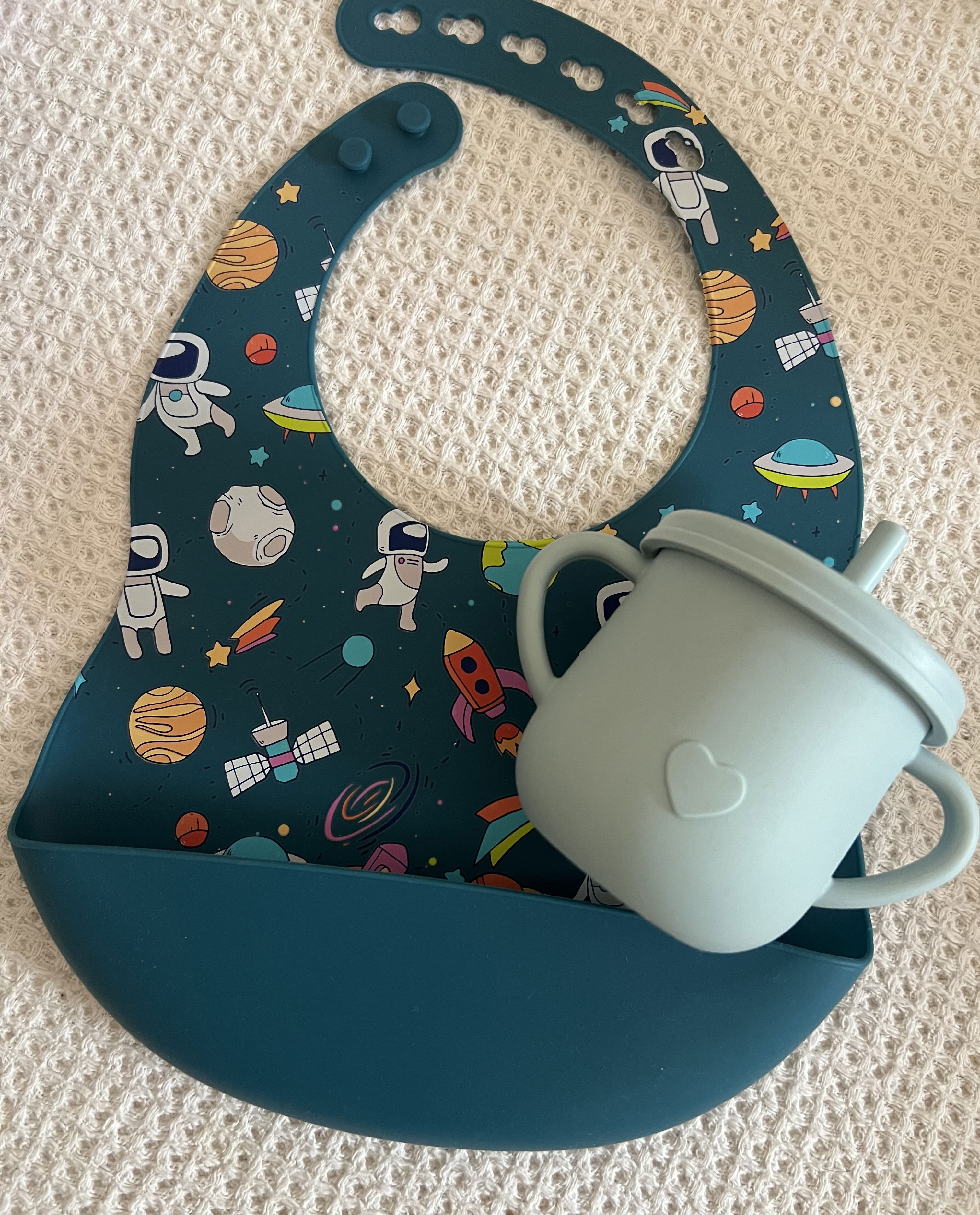 El babero de silicona tiene atrapamigas profundo para evitar derrames, y el vaso con bombilla ayuda a desarrollar la autonomía mientras toman sus primeras bebidas.